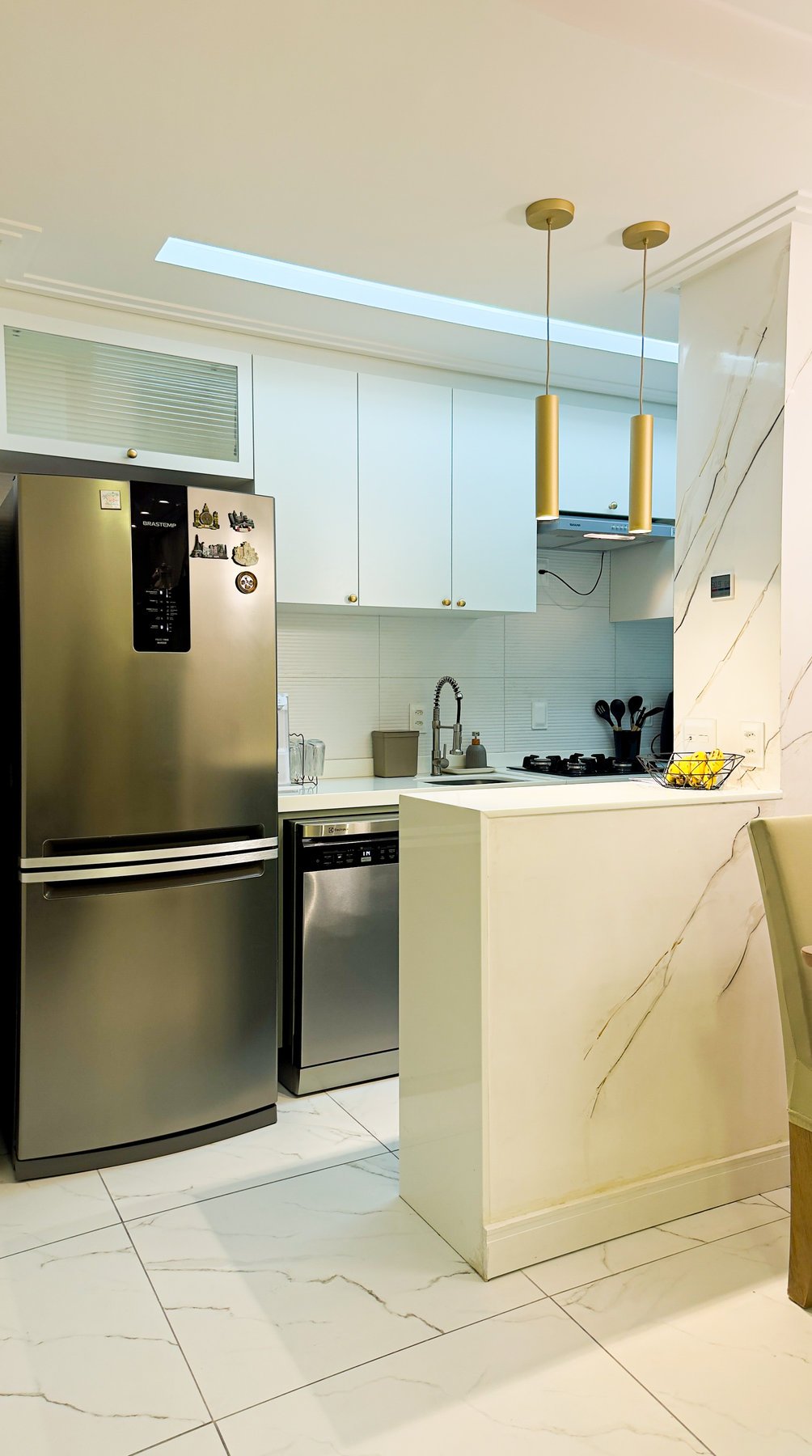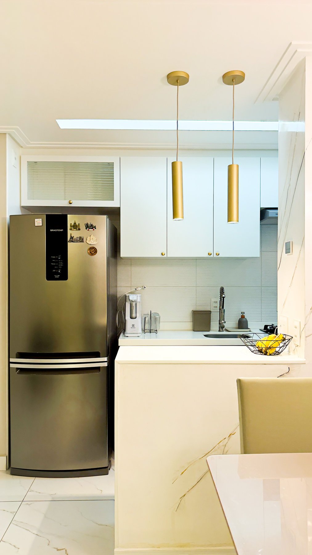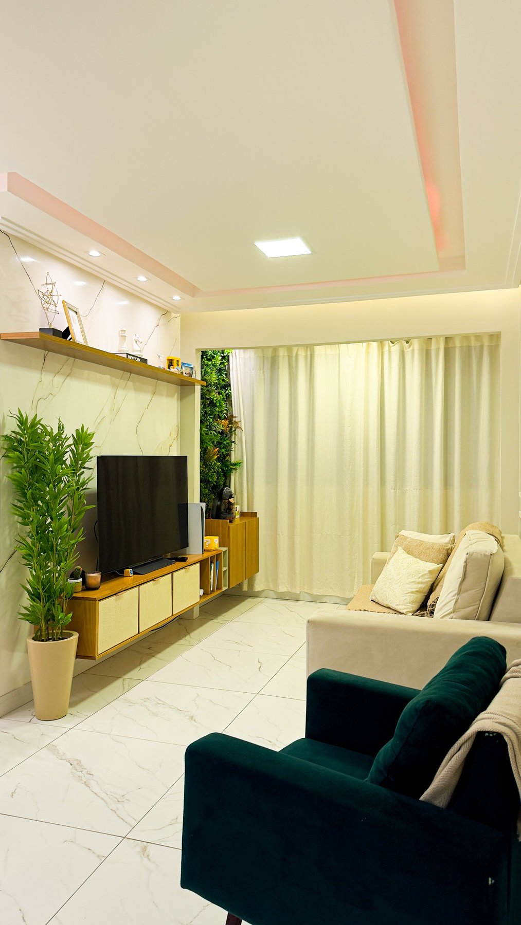 Para iluminação utilizamos tom amarelado, tornando o espaço super aconchegante e acolhedor. Estamos aproveitando quase toda a iluminação existente, apenas em alguns ambientes demos uma atualizada para deixar o espaço mais eficiente.