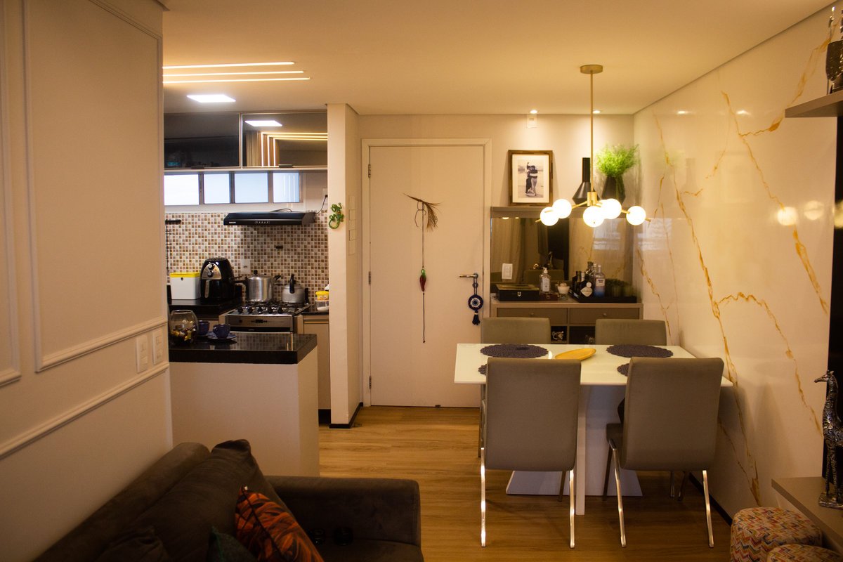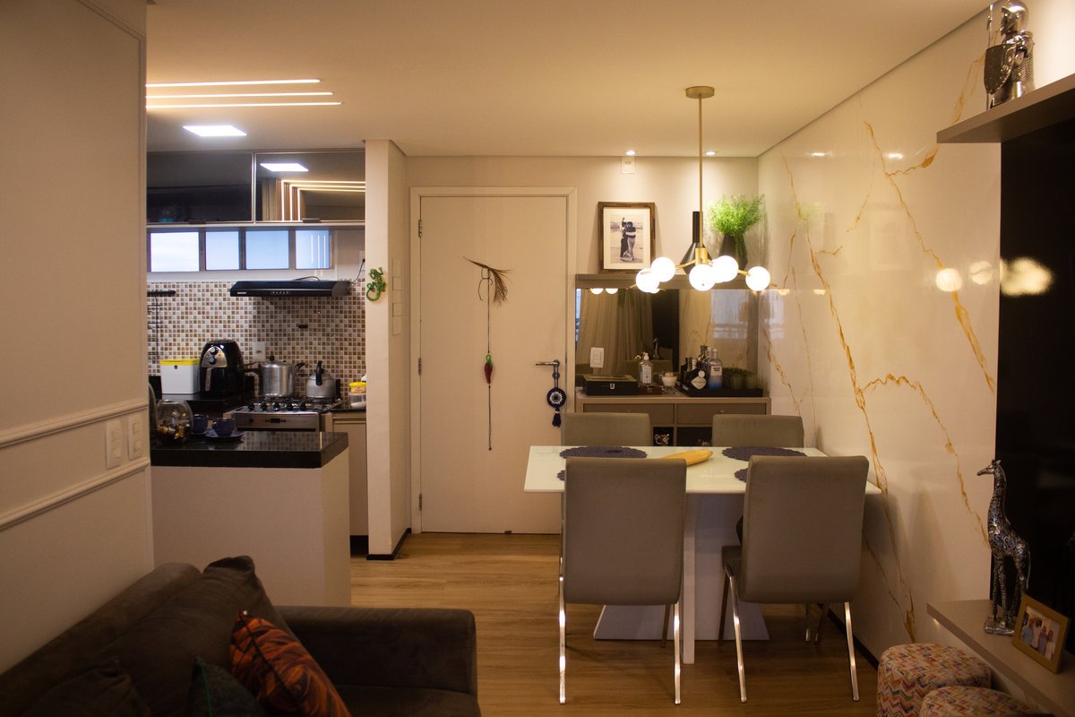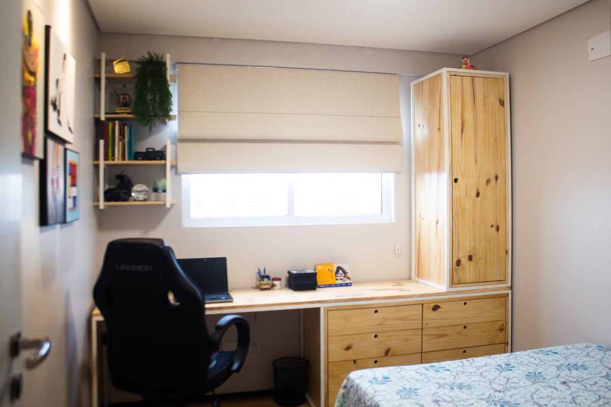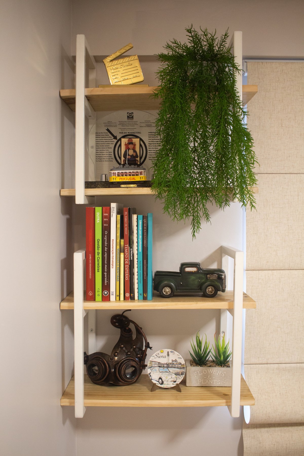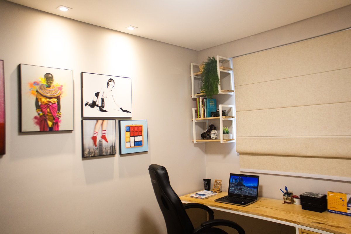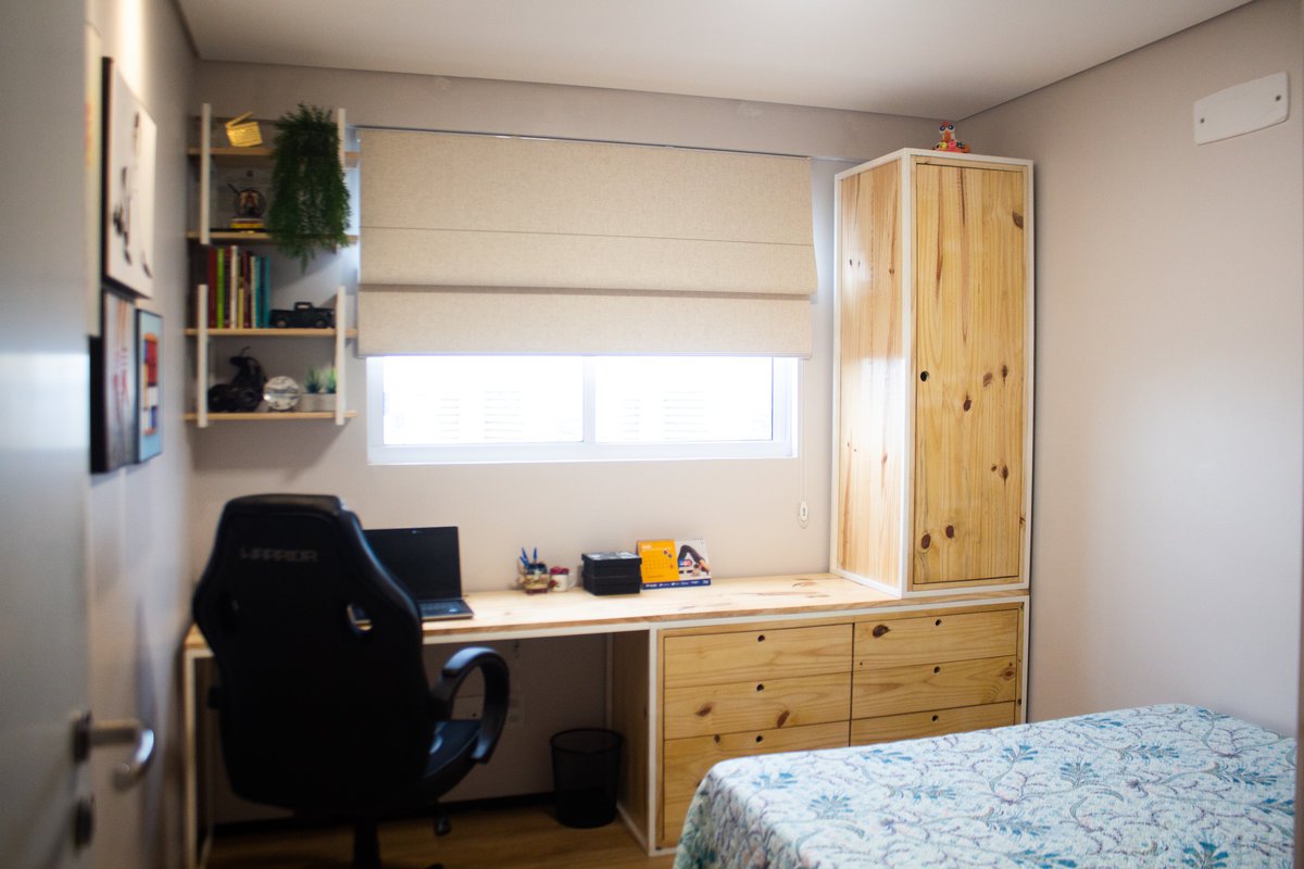 A ideia desse apartamento era trocar todo o piso por piso vinílico amadeirado, aproveitar todos os móveis existentes, pintar o apartamento e melhorar a iluminação. O ambiente que fizemos mais intervenção foi o escritório, onde a referência e o pedido era um espaço feito com móveis de pinus e metalon, para não ficar com a estética industrial demais, trabalhamos com o metalon