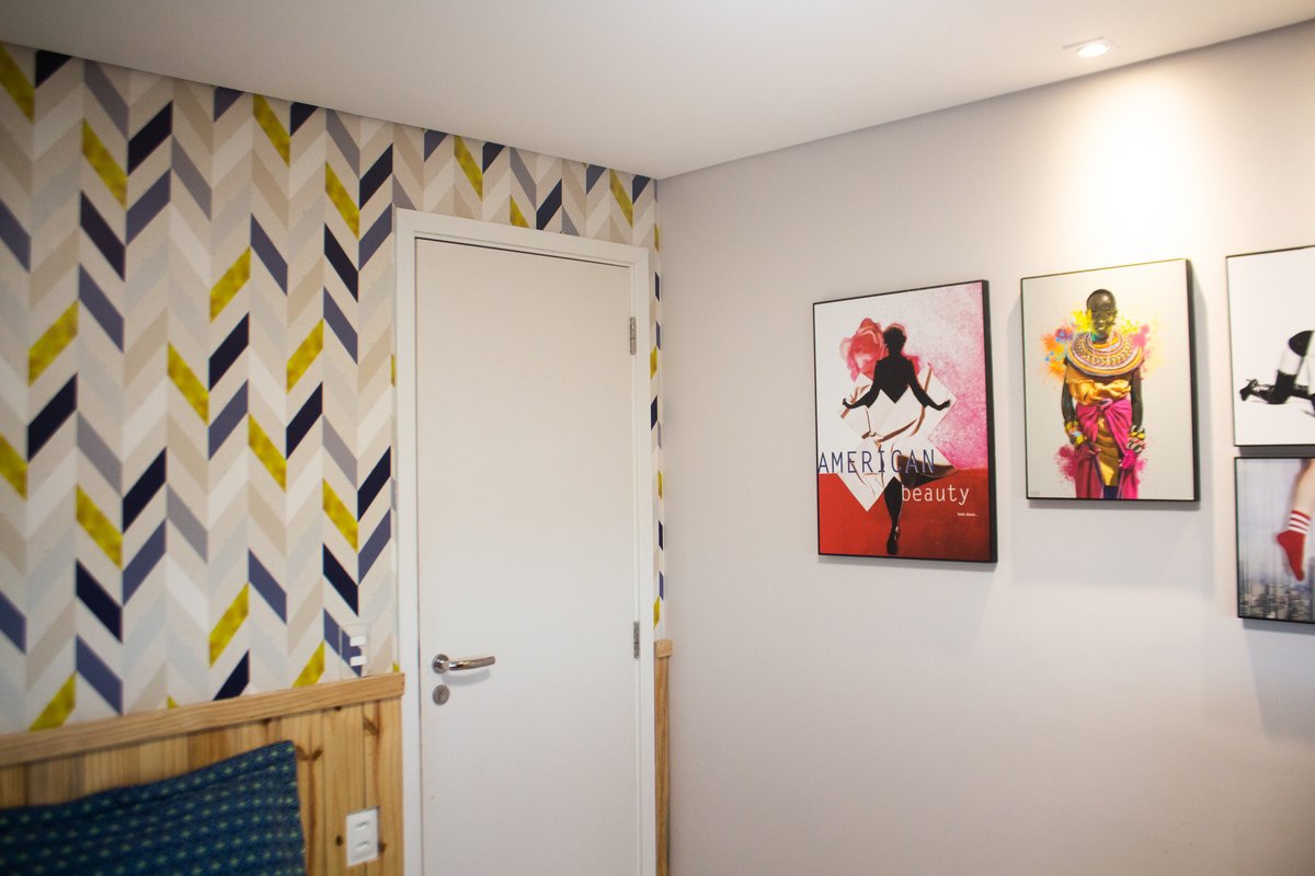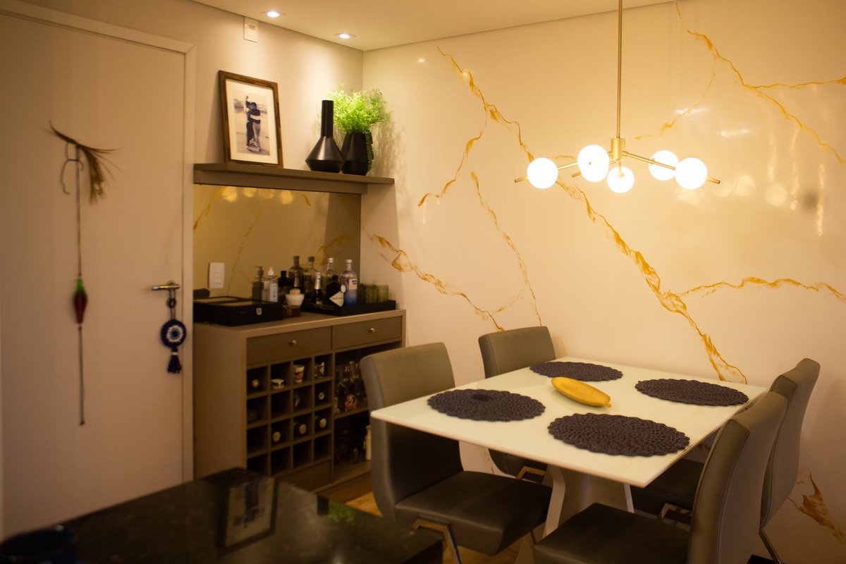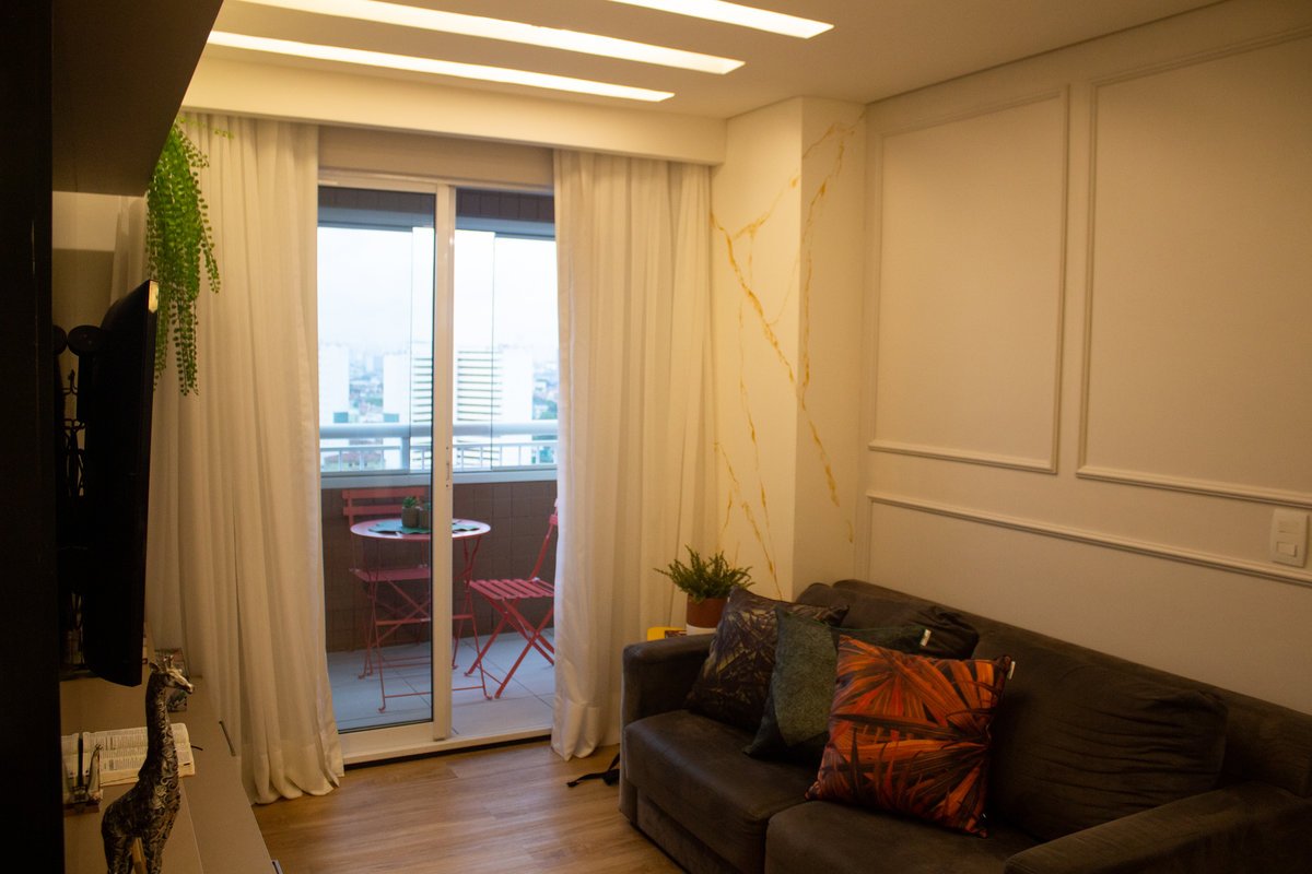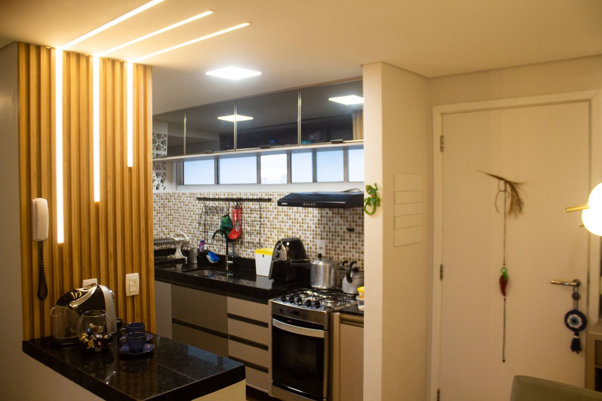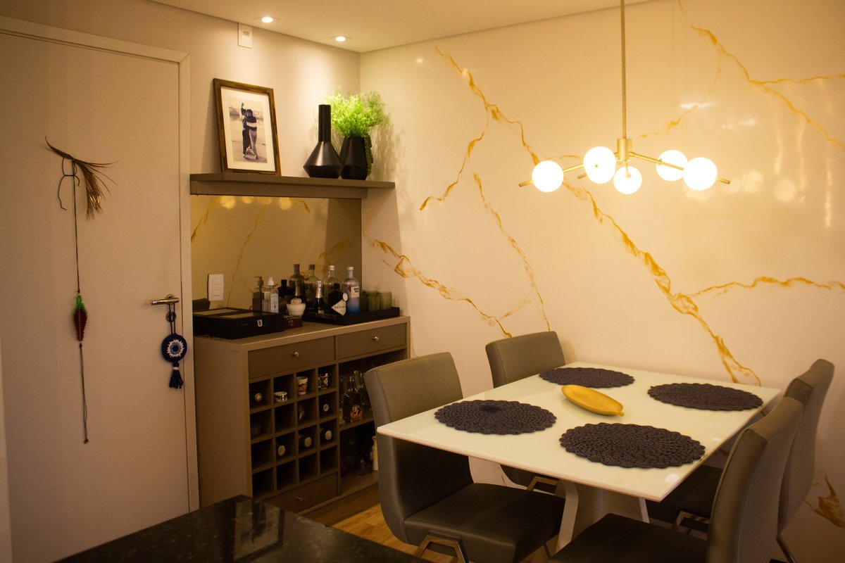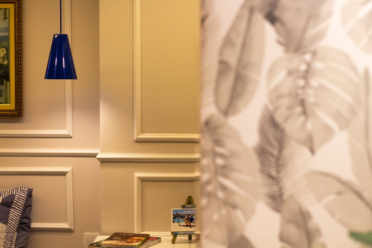 A ideia desse apartamento era trocar todo o piso por piso vinílico amadeirado, aproveitar todos os móveis existentes, pintar o apartamento e melhorar a iluminação. O ambiente que fizemos mais intervenção foi o escritório, onde a referência e o pedido era um espaço feito com móveis de pinus e metalon, para não ficar com a estética industrial demais, trabalhamos com o metalon