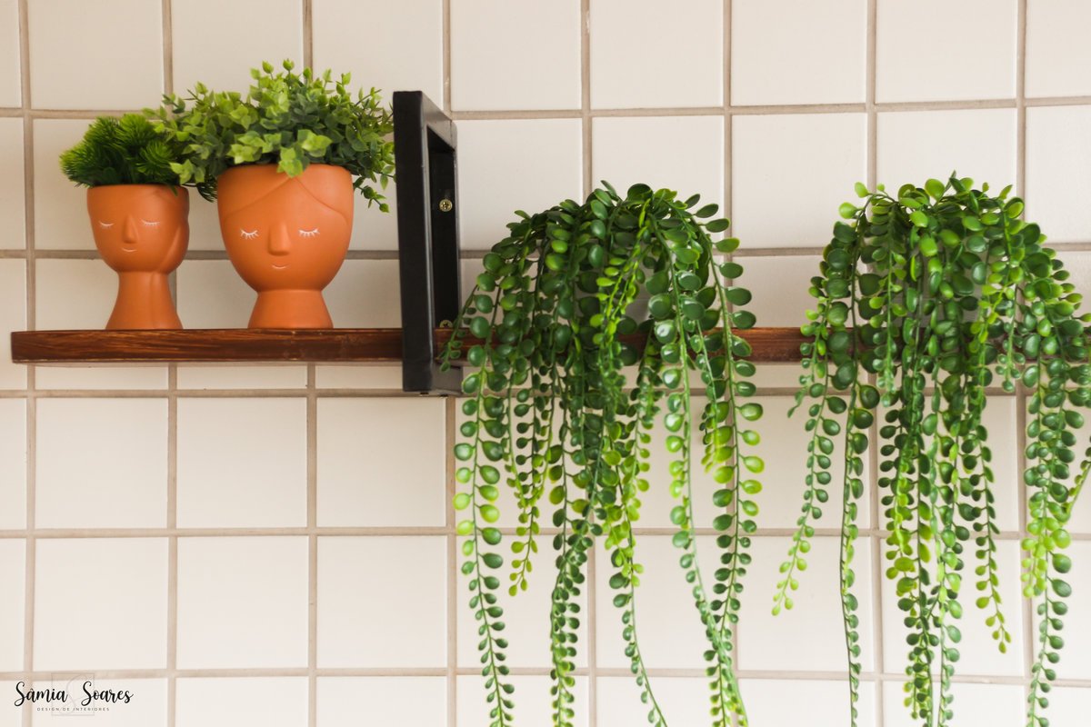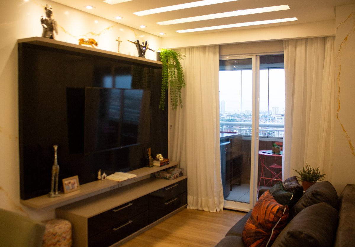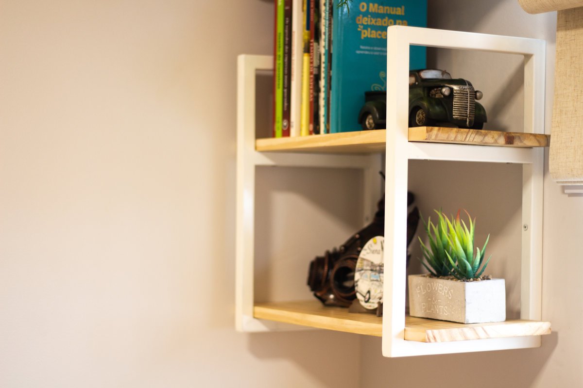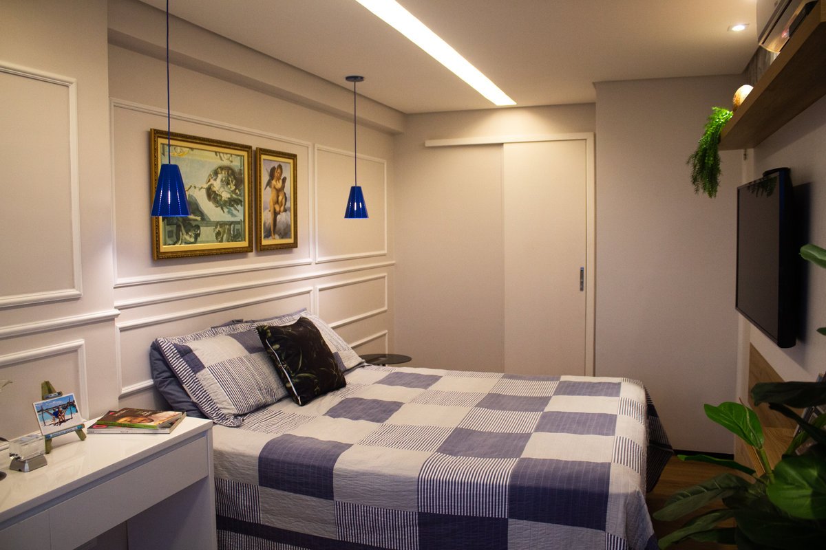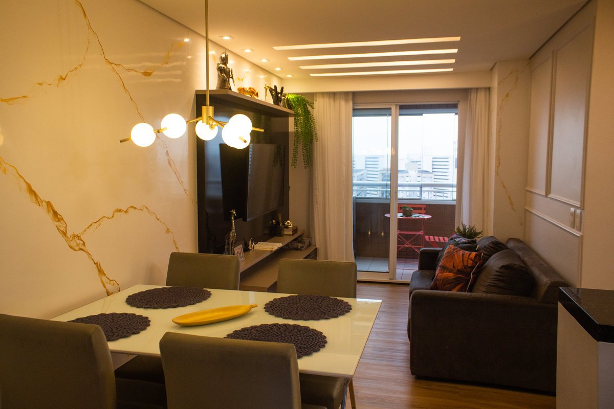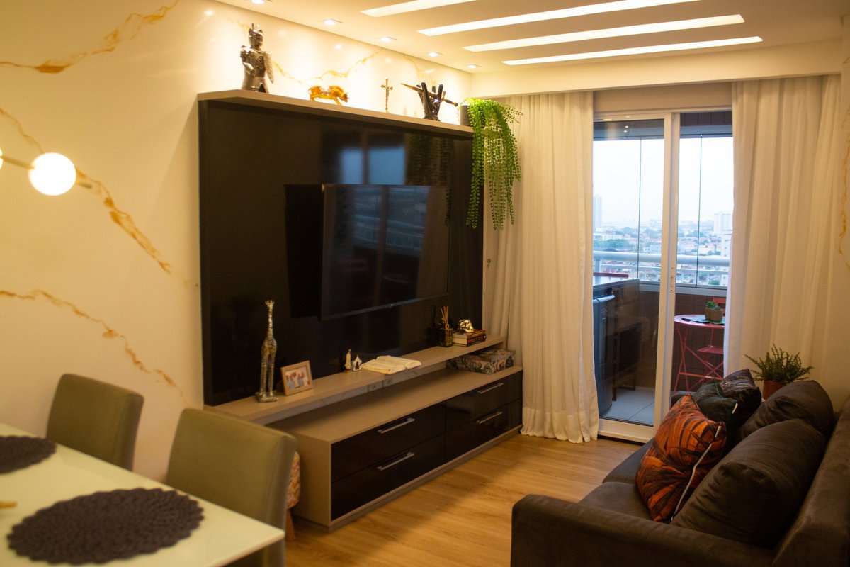 A ideia desse apartamento era trocar todo o piso por piso vinílico amadeirado, aproveitar todos os móveis existentes, pintar o apartamento e melhorar a iluminação. O ambiente que fizemos mais intervenção foi o escritório, onde a referência e o pedido era um espaço feito com móveis de pinus e metalon, para não ficar com a estética industrial demais, trabalhamos com o metalon