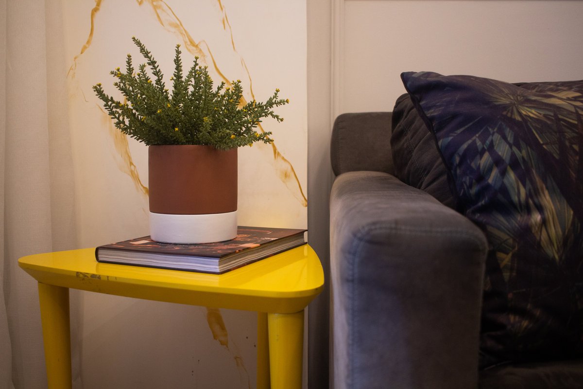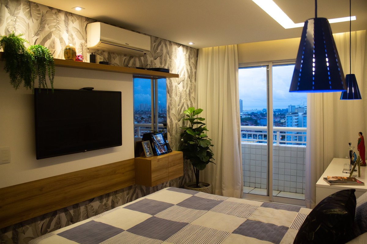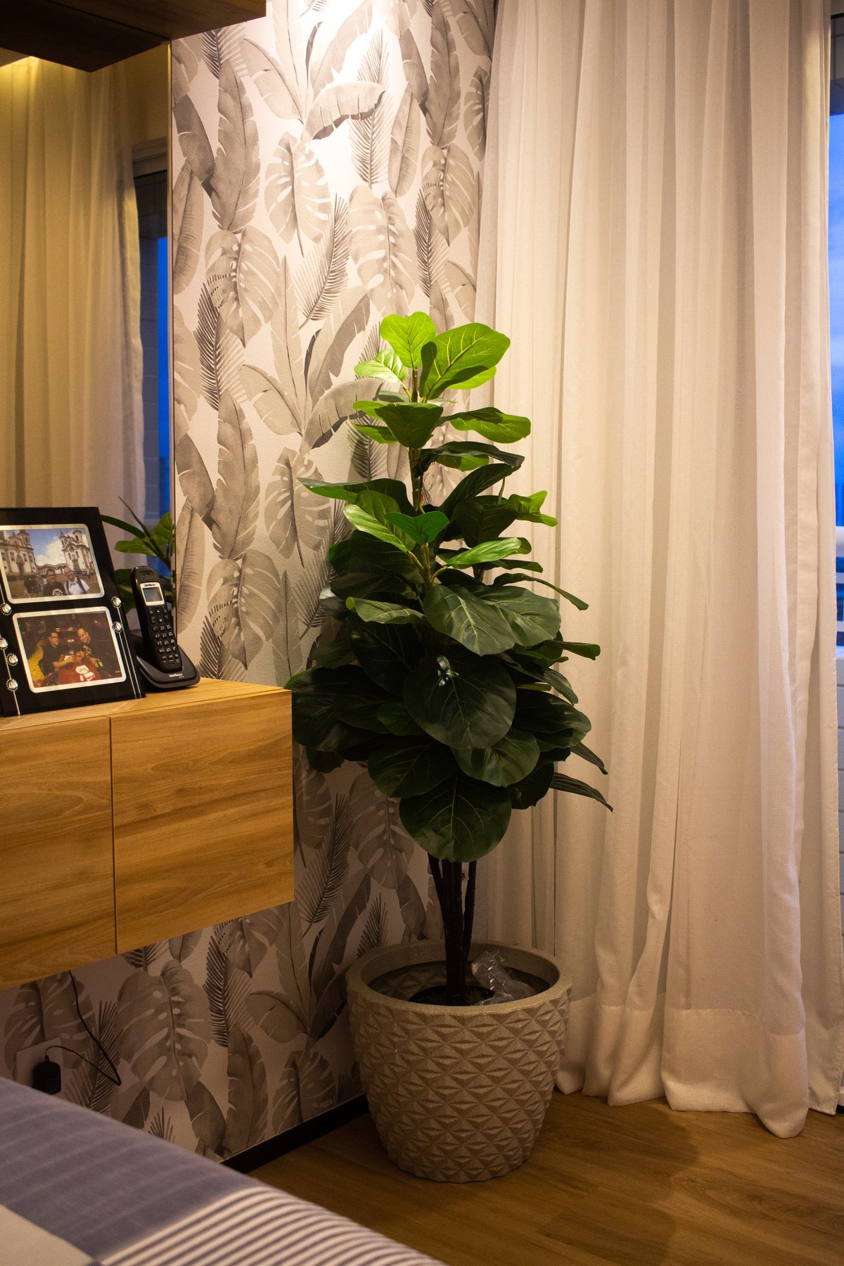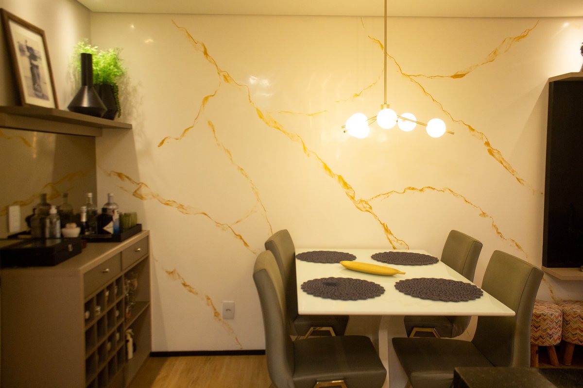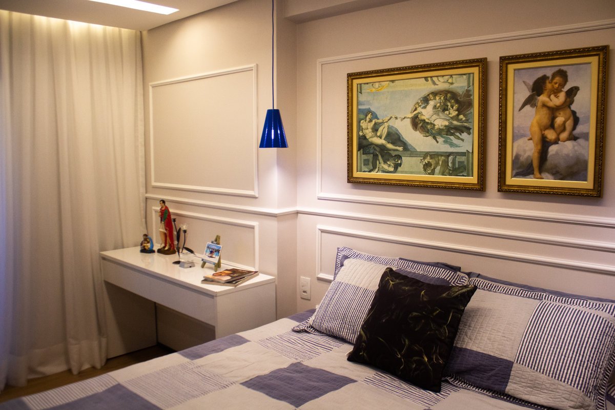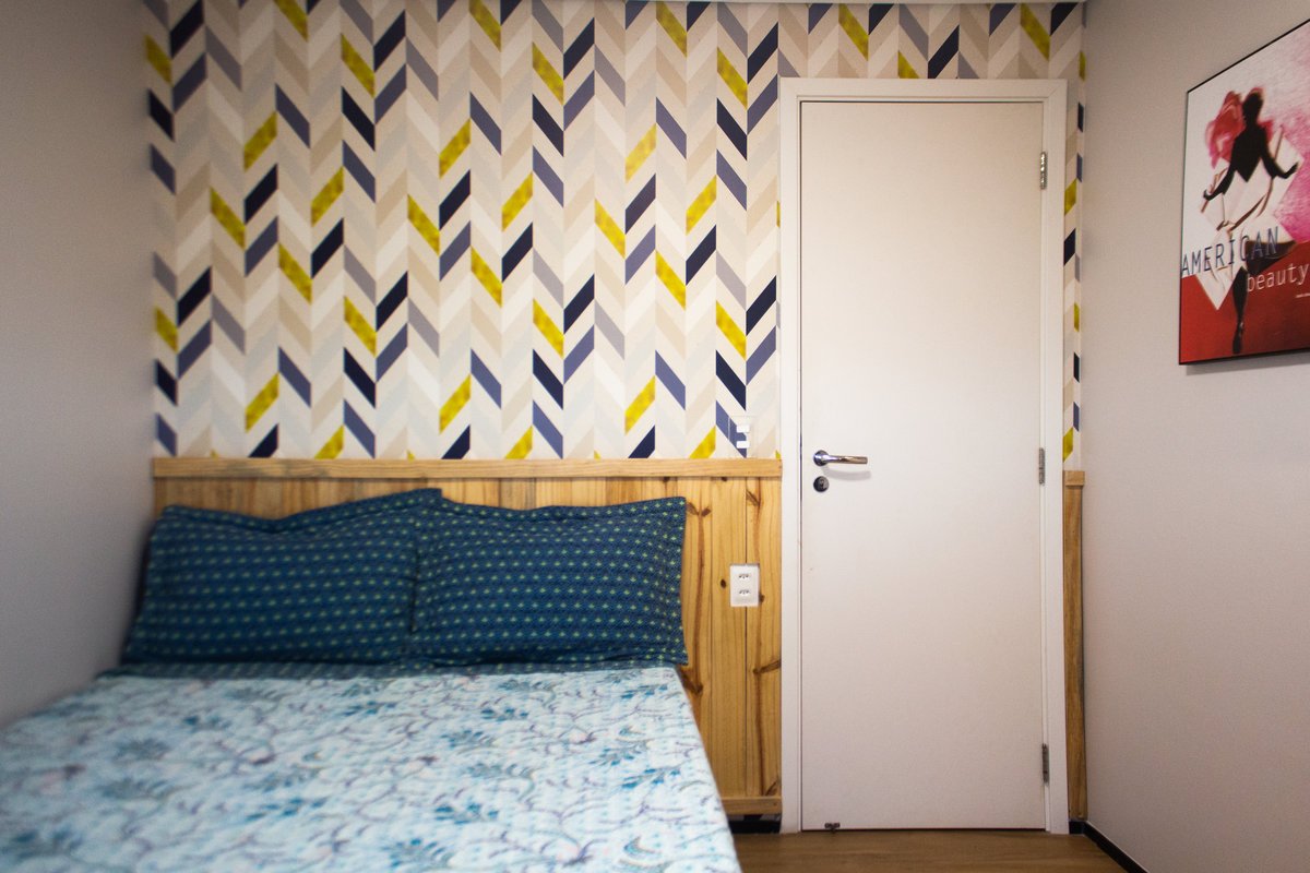 A ideia desse apartamento era trocar todo o piso por piso vinílico amadeirado, aproveitar todos os móveis existentes, pintar o apartamento e melhorar a iluminação. O ambiente que fizemos mais intervenção foi o escritório, onde a referência e o pedido era um espaço feito com móveis de pinus e metalon, para não ficar com a estética industrial demais, trabalhamos com o metalon