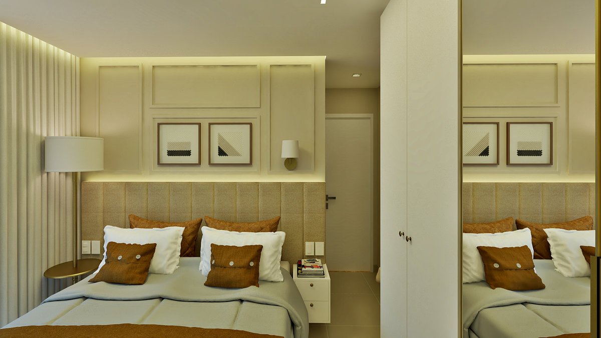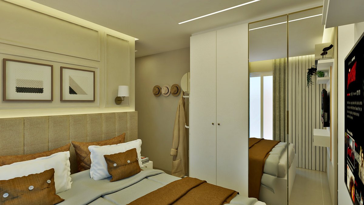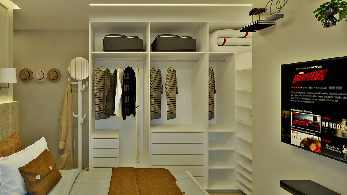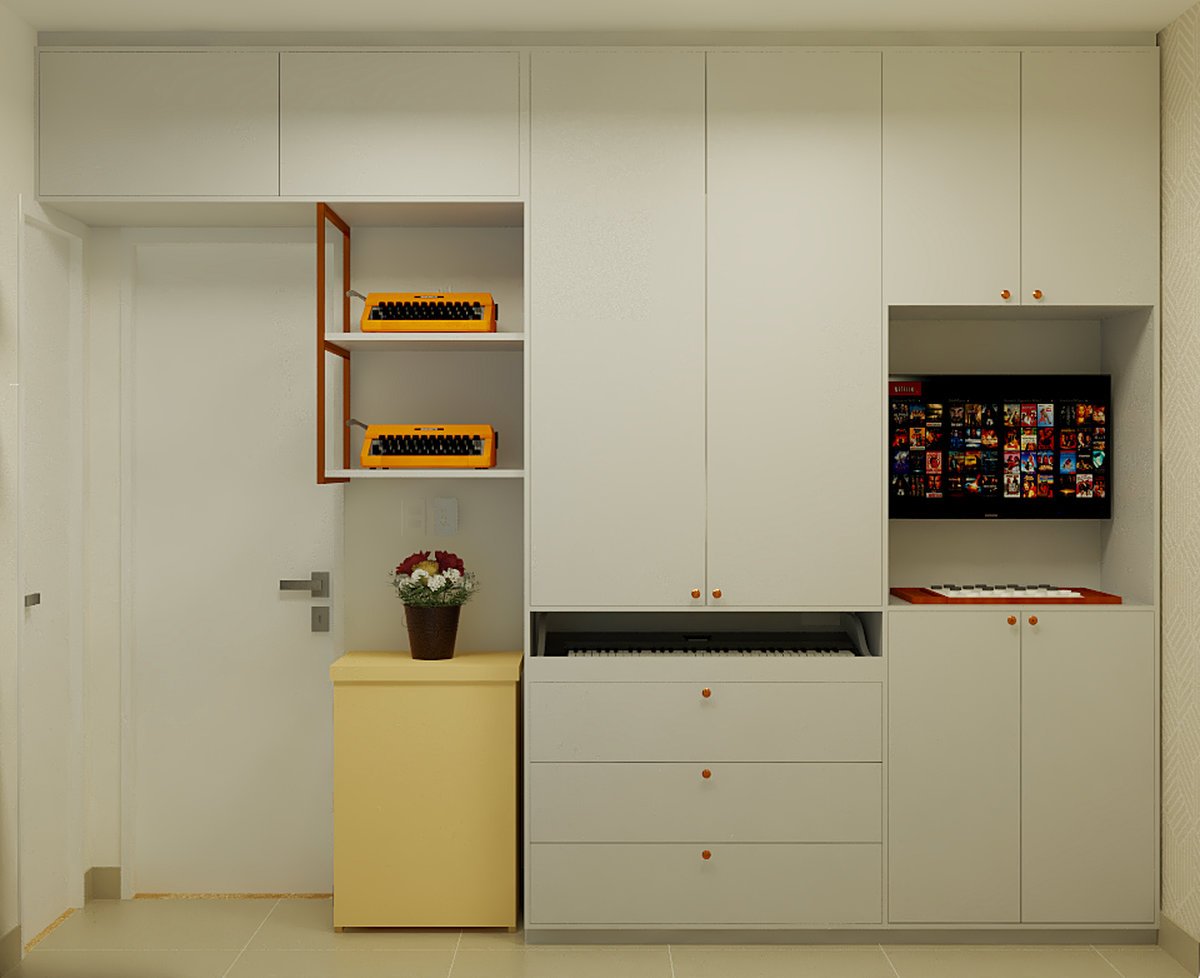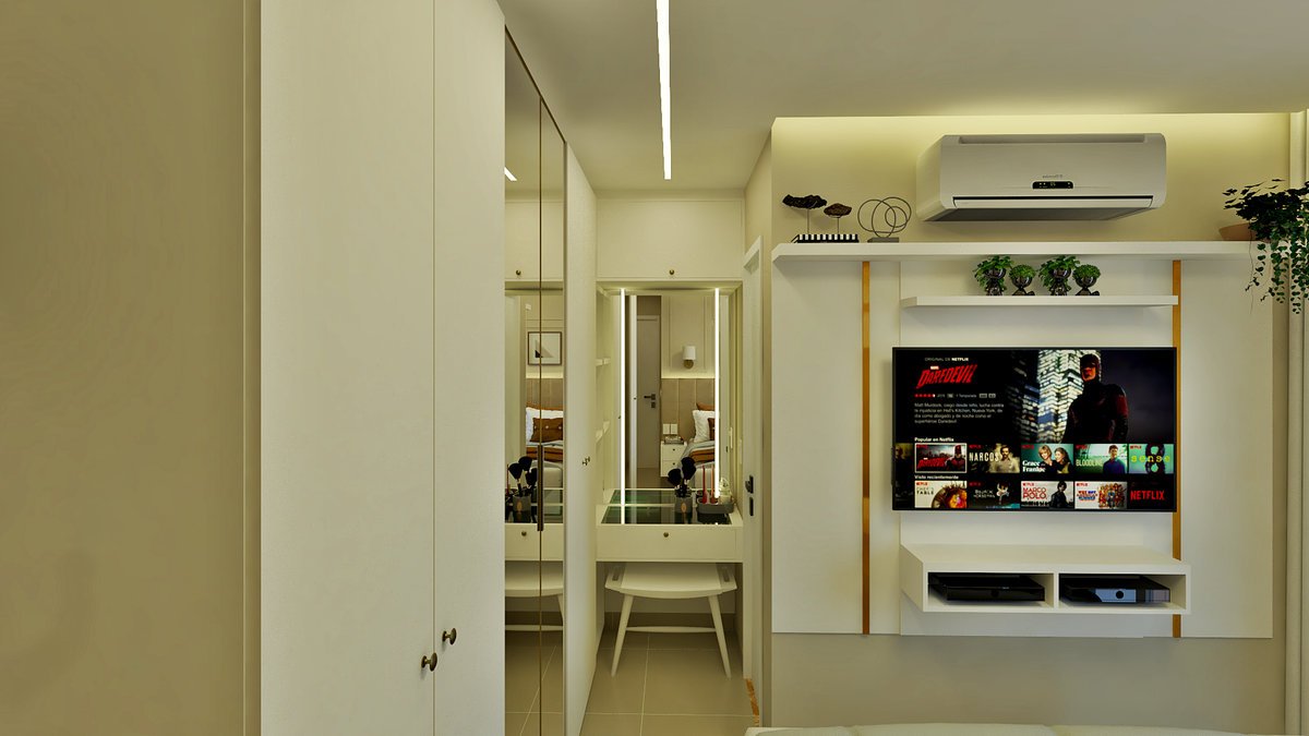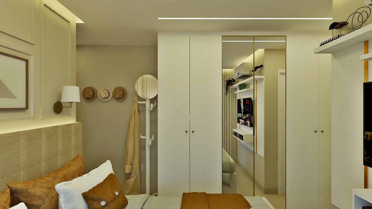 Um dos pedidos da cliente foi aproveitamento de todos os espaços com armários. Conseguimos fazer isso de forma leve e organizada. Usamos tons neutros para trazer amplitude e sensação de calma para os espaços. Conseguimos aproveitar todos os mobiliários existentes e valorizar todos os itens pessoais com valor afetivo.